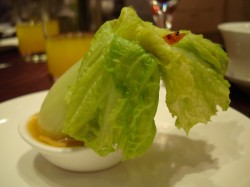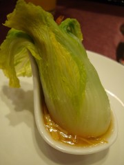 幾道菜之後,翠玉白菜終於來了。一顆菜就裝在湯匙裡面,上面擺了個蝦米冒充螽斯。這到底是什麼菜?