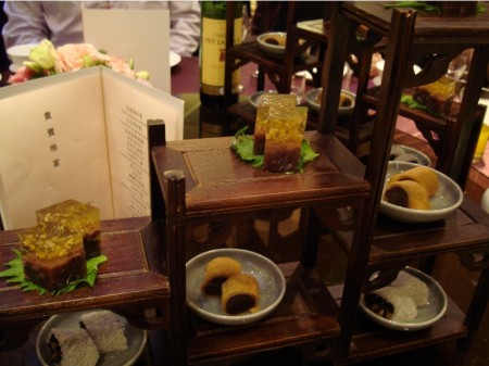 下面這個是多寶閣,挺好看,尤其是上面的桂花紅豆糕,晶瑩剔透。因為那多寶閣是木頭的,從裡面拿食物出來,有種把食物從抽屜裡拿出來偷偷摸摸的感覺…