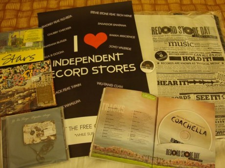 終於要進入標題了,我去結帳的時候店員大概看我一臉新來的樣子,很好心地提醒我說那邊桌子有東西可以拿,我呆呆地走過去才發現這些是唱片行日的贈品,哇我真是太會挑日子了,今天是唱片行日耶(Record Store Day 美國時間是4/17)。我拿了環保袋、海報、別針跟一張 CD,耶這次的丹佛行可以用這個作結真是太讚了!