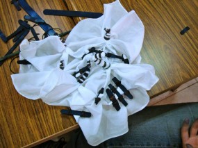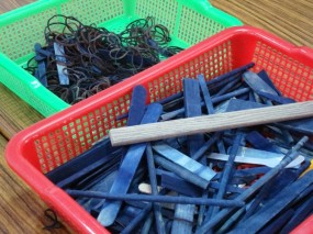 因為藍染節有補助,所以一百元就可做一張方巾,桌上有提供橡皮筋跟竹籤,基本上就是把它綁一綁,綁住的地方會變白的,沒有綁住的地方是藍的,我是綁到後來才想到可以把它當剪紙,把布折整齊應該可以開發出一些圖案。綁好之拿去染缸裡面染,因為希望藍色深一點,多染了一次,果然是有夠藍的。染的時候因為兩隻手要泡在染汁裡面搓,好像把手套弄破了,兩手藍藍的都洗不太掉,也算是紀念品。