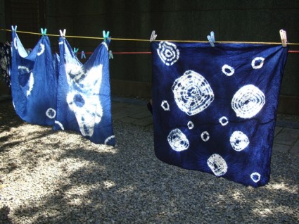 最藍的那塊就是我的,好藍,真得意。本來底色想要有稍微揉過的效果,但是中間不小心攤了開來所以變成均勻的藍色。這個帶回家要再放一週之後再用醋定色,乾了以後應該會稍微淺一點,所以在陽光下有點濕的樣子應該是最好看的時候吧。