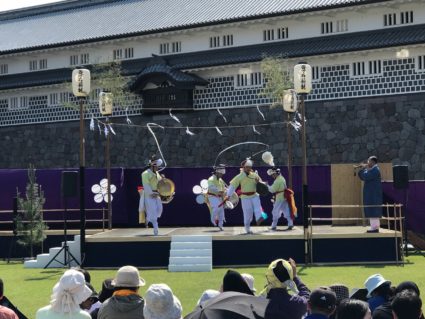 在金澤城公園有個「盆正月」的活動,有一些表演活動和各種食物與遊戲攤位,舞台和攤位擺設都顯得很雅緻,有看來很古典的投扇興、千本引き,然後看到這個有趣的朝鮮象帽舞,頭一甩那上面的絲帶就很空靈地飄來飄去(有人說這是綁在頭上的鬥貓棒),配合著旁邊那位嗩吶老先生的音樂,一邊打鼓、旋轉、跳躍,非常熱鬧。