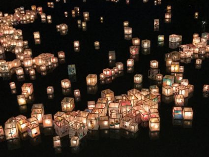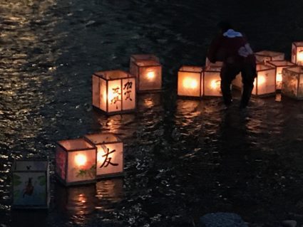 放水燈的照片很美麗,但去了才知道河的兩岸滿滿都是人,跟照片裡呈現的幽暗靜謐之美是有差別的。燈籠實在很難拍,最後離開前經過人潮眾多以致行進緩慢的淺野川大橋時,隨手拍了幾張,竟然還蠻美的。